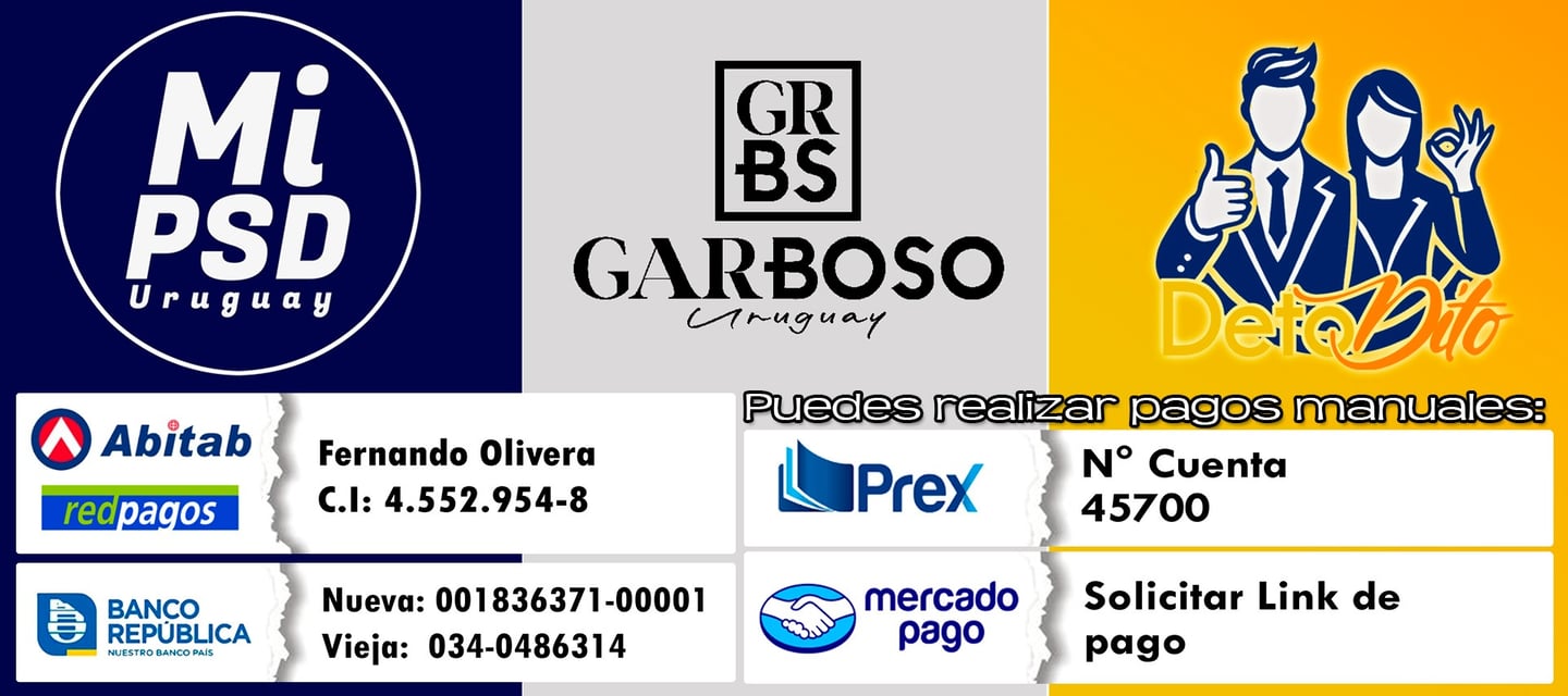 Luego de realizar el pago informar al 092013348 (MiPSDUruguay) / 092932225 (DetoDito)enviando comprobante de pago.